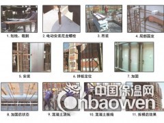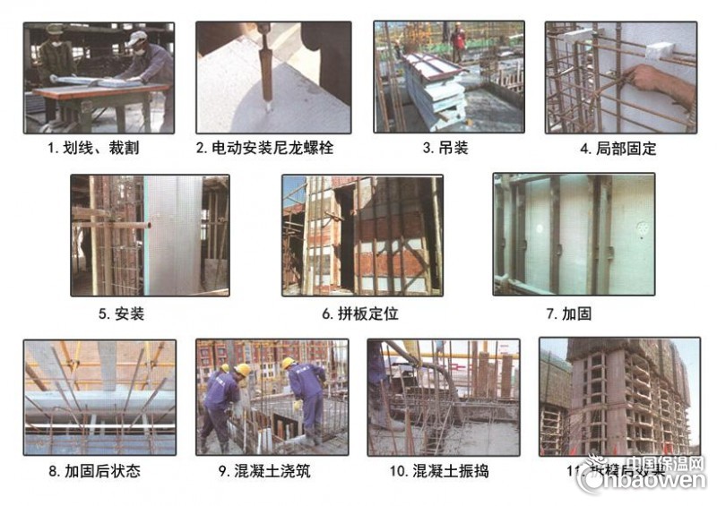 1、划线、切割;2、电动安装尼龙螺栓;3、吊装;4、局部固定;5.安装;6、拼版定位;7、加固;8、加固后状态;9、混凝土浇筑;10、混凝土振捣;11、拆模后效果